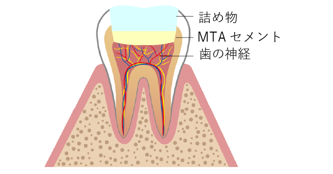 そこで活躍するのが、「MTAセメント(自費)」という特殊なセメント薬剤です。MTAセメントは、封鎖性・殺菌性に優れており、神経を守りながら治療できる方法になります。