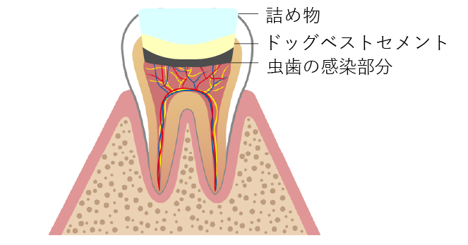 虫歯の感染部分にドックベストセメント(自費)を塗布することで、金属イオンの殺菌効果で、歯を削らずに虫歯菌を死滅させることができます。また、ミネラルの作用により歯の再石灰化を促進する効果もあります。